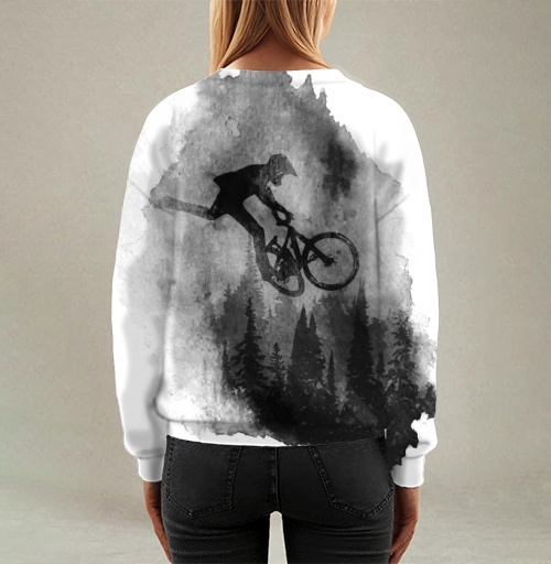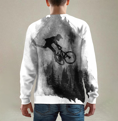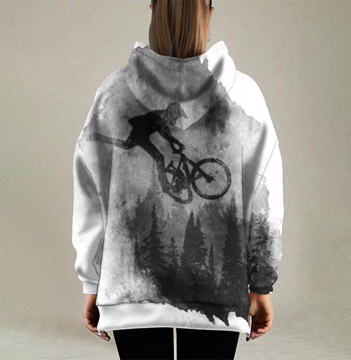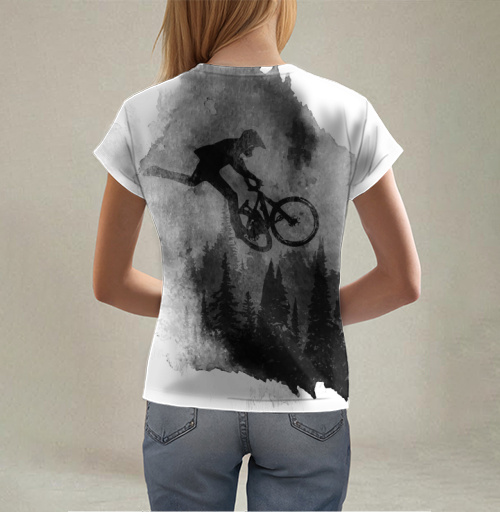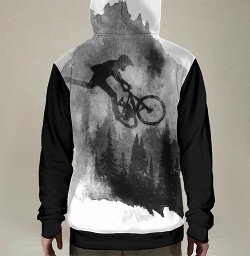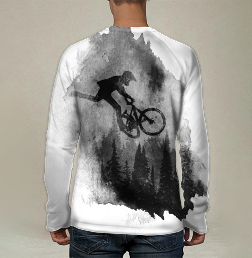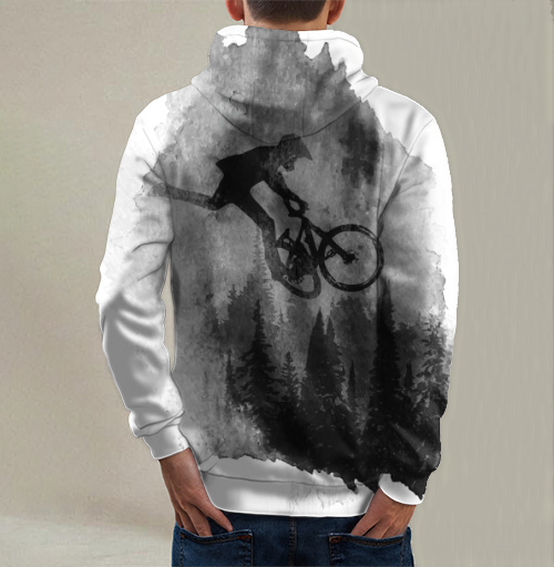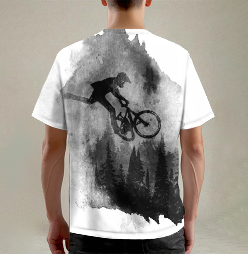 Велосипед, прыжок, горы и лес — вот суть экстремального спорта, который покоряет сердца адреналинозависимых людей. Дизайн демонстрирует силуэт велосипедиста, совершающего смелый прыжок в воздухе, на фоне гор и лесного пейзажа. Композиция выполнена в чёрно-серых тонах с размытым эффектом, создающим ощущение скорости и динамики. Фигура райдера запечатлена в момент максимального полёта, когда велосипед и гравитация танцуют в воздухе. Горы и лес позади создают драматическую сцену, подчёркивая величину вызова и опасности.
