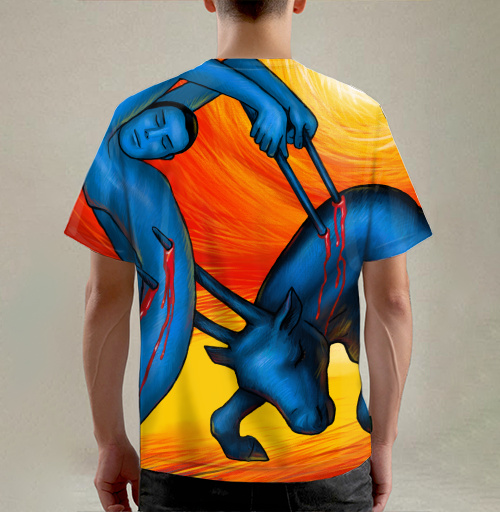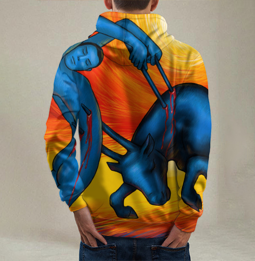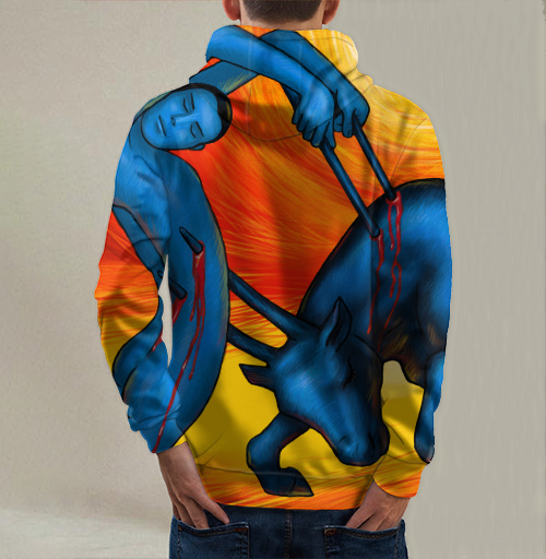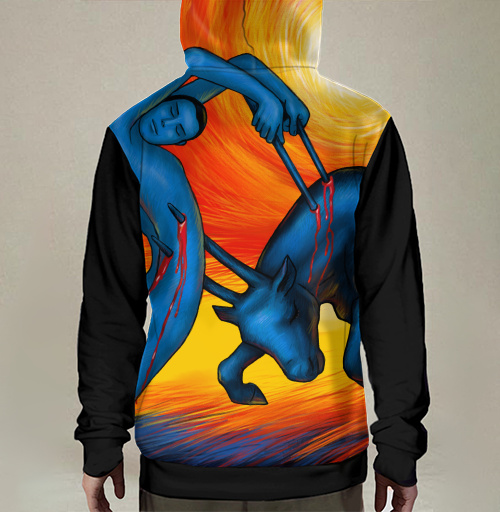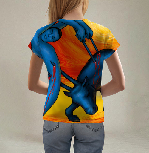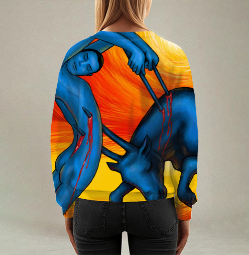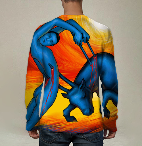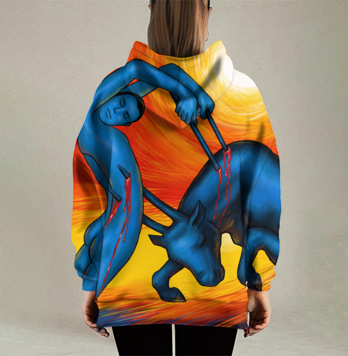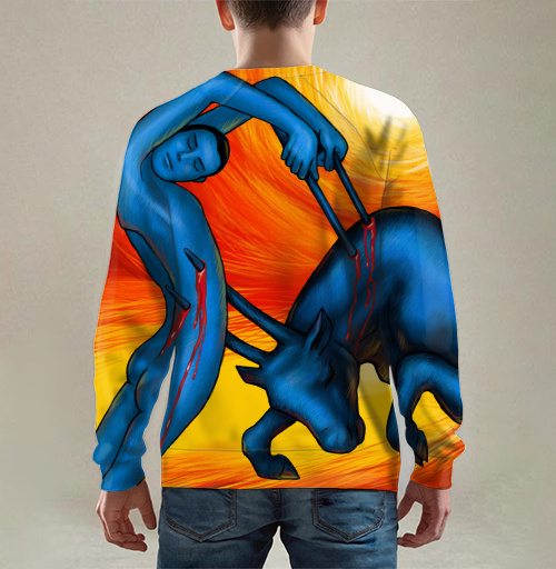 Эпический принт с динозавром в закатных лучах переносит зрителя в мезозойскую эру, когда гигантские рептилии правили планетой. Мощный силуэт тероподного хищника выполнен в насыщенных синих тонах с градиентными переходами от глубокого индиго до ярко-голубого, создавая объёмную фактурную поверхность кожи. Динозавр изображён в характерной позе - передние лапы подняты вверх, массивные задние конечности твёрдо стоят на земле, а хвост служит балансиром. Анатомические детали проработаны тщательно, от мускулистых ног до изгиба шеи и раскрытой пасти.
