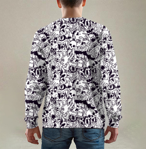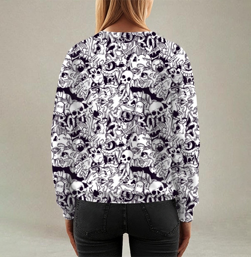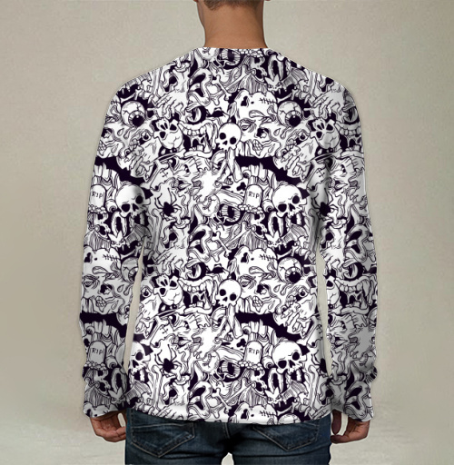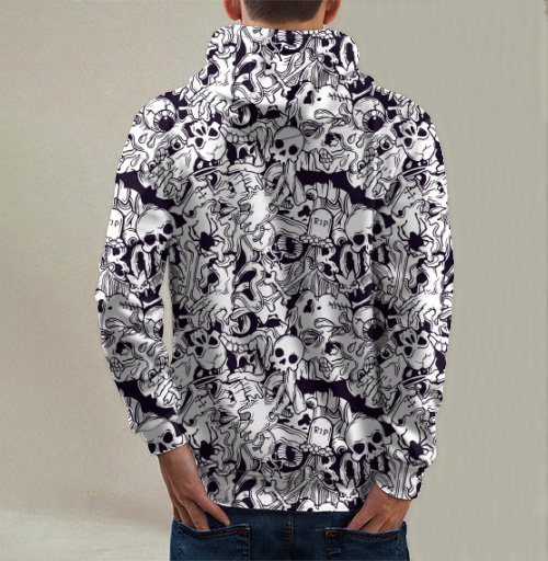 Паттерн из серии "Хеллоуин", разработанный в стилистике хоррор-комиксов и граффити. Бесшовная композиция объединяет десятки жутких персонажей и символов: оскаленные черепа с горящими глазами, зомби с рваными ртами, летучие мыши с распростертыми крыльями, ухмыляющиеся тыквы, костлявые руки и мистические существа. Каждый элемент прорисован с нарочитой грубостью, словно граффити на стенах заброшенного здания или иллюстрация из андеграундного комикса ужасов.
