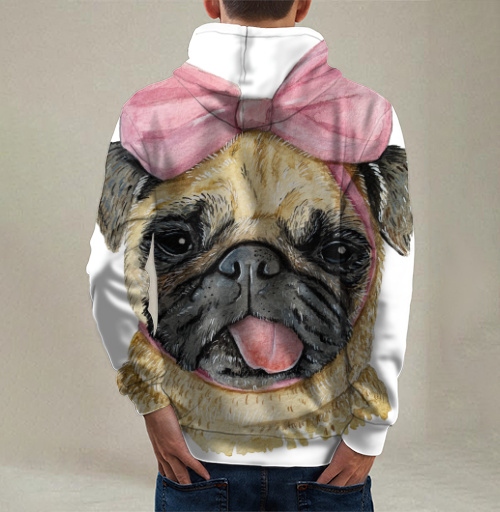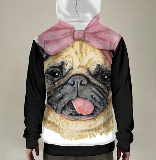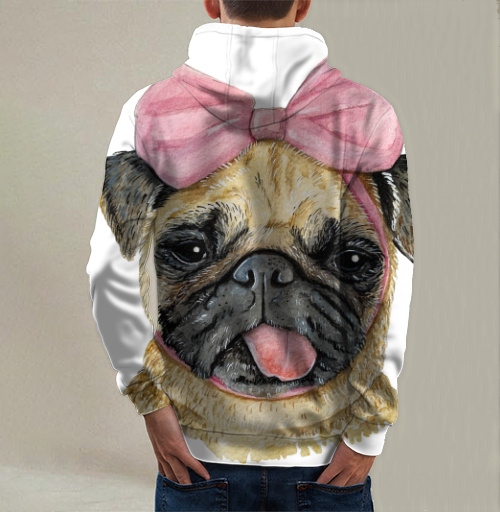Принт представляет собой очаровательный реалистичный портрет собаки породы мопс, выполненный в технике цветной графики с элементами акварельной живописи и цифровой иллюстрации, дополненный декоративным аксессуаром в виде крупного розового банта. Изображение мопса выполнено с высокой степенью детализации и анатомической точностью, передающей характерные породные особенности этих декоративных собак. Голова мопса изображена в фас, демонстрируя типичную округлую форму черепа с короткой приплюснутой мордочкой, выраженными складками кожи на лбу и щеках, крупными выразительными карими глазами с живым взглядом, маленькими треугольными висячими ушами тёмного окраса. Мордочка имеет характерную чёрную маску с темными складками вокруг короткого носа и рта, из которого высунут розовый язычок, придающий образу игривость и дружелюбие. Шерсть мопса передана с текстурной детализацией множеством коротких штрихов и мазков в бежево-палевых, песочных, кремовых, золотистых оттенках с переходами тонов, создающих объём и реалистичность. На шее видна тёмная полоска ошейника синего цвета. Главным декоративным акцентом композиции выступает крупный пышный бант, расположенный на макушке между ушами мопса, выполненный в нежных розово-лиловых тонах с атласным блеском и тщательной проработкой складок ткани, узла и свисающих концов ленты. Бант добавляет образу женственности, миловидности и праздничности. Композиция построена как классический анималистический портрет с акцентом на выразительность взгляда и обаяние персонажа. Стиль объединяет реалистичную анималистику, декоративную графику, милую эстетику. Идеален для любителей мопсов, собак, домашних животных, анималистических портретов, милых персонажей.