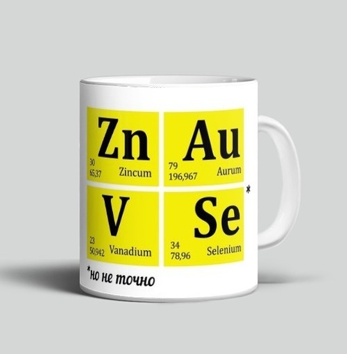 Остроумная игра слов через призму периодической таблицы Менделеева: четыре химических элемента — Zn (цинк), Au (золото), V (ванадий), Se (селен) — складываются в графический ребус с фразой "не не такой" внизу. Яркие жёлтые квадраты на глубоком чёрном фоне воспроизводят узнаваемую эстетику периодической системы, где каждая ячейка содержит символ элемента, его полное название и атомный номер, создавая визуальный код для тех, кто понимает.