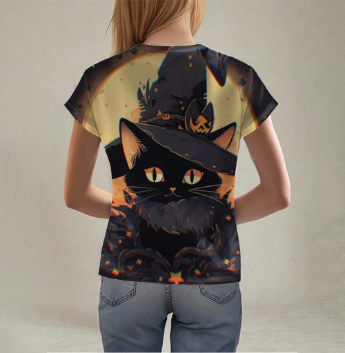 Цветовая гамма построена на сочетании глубоких чёрных тонов с тёплым золотисто-оранжевым свечением луны и магических искр. Детализация шерсти кошки, текстуры шляпы и осенних листьев выполнена с высокой степенью реалистичности. Композиция идеально передаёт дух Хэллоуина, осенней магии и готической эстетики, объединяя милоту с мистикой.