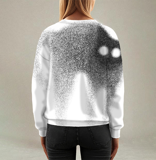чарующая монохромная композиция в готическом стиле, изображающая мистическую кошку с преувеличенно большими выразительными глазами. художественная техника напоминает точечную графику или пуантилизм: тело животного сформировано из тысяч мельчайших точек и частиц, создающих эффект дымчатой, почти призрачной текстуры. верхняя часть силуэта более плотная и насыщенная, постепенно растворяясь к низу в облако рассеивающихся частиц. огромные круглые глаза с яркими белыми бликами становятся композиционным центром, притягивая взгляд своей