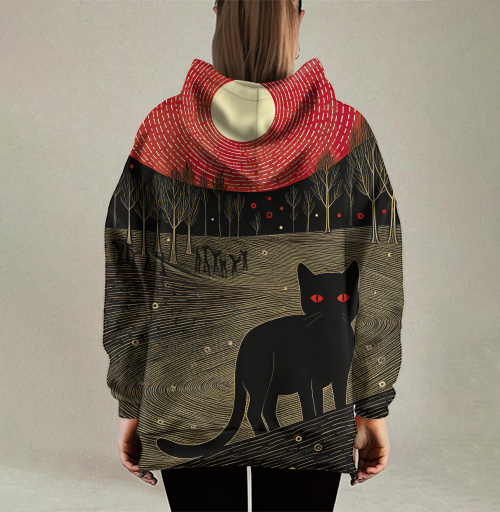 Худи оверсайз женское с капюшоном 3Д купить – черный котэ и луна –